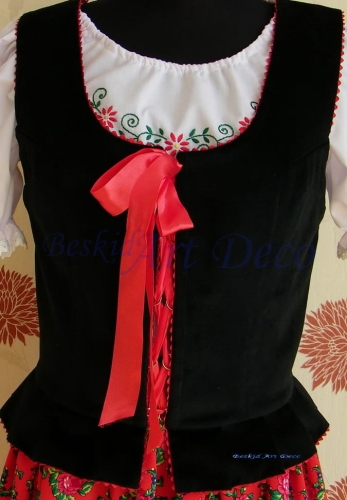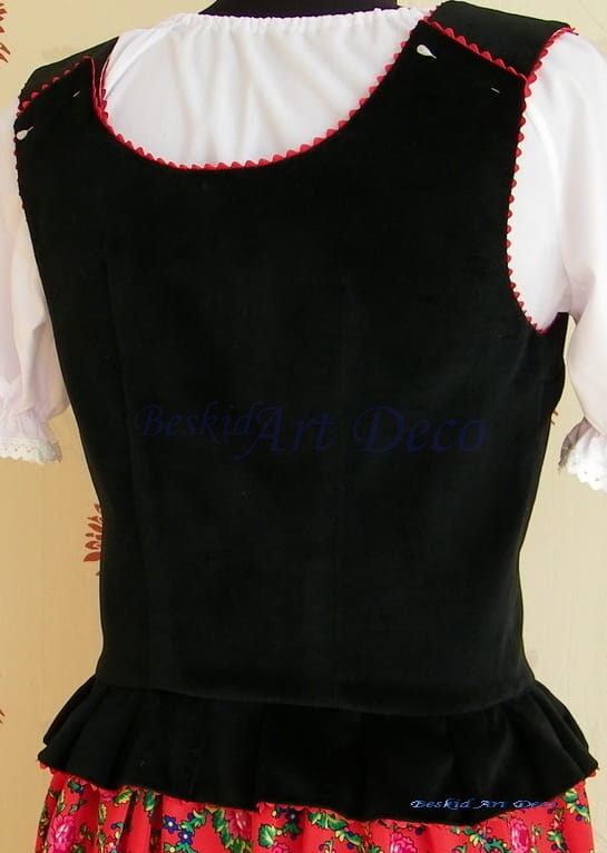 Ozdobiony czerwoną taśmą ząbkową lub lamówką , może ona być wszyta między tkaniny lub gorset może nią być ozdobiony po wierzchu
