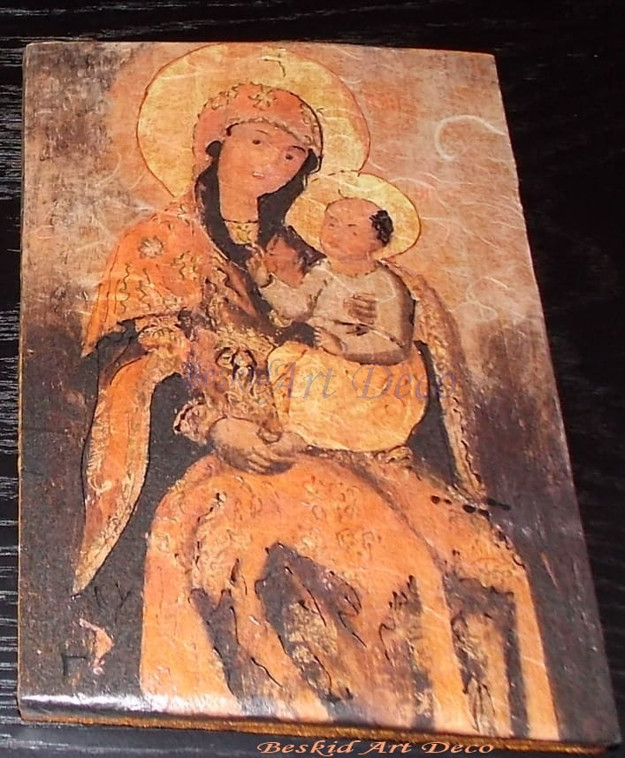 Wizerunek Matki Boskiej z dzieciątkiem wykonany metodą decoupage