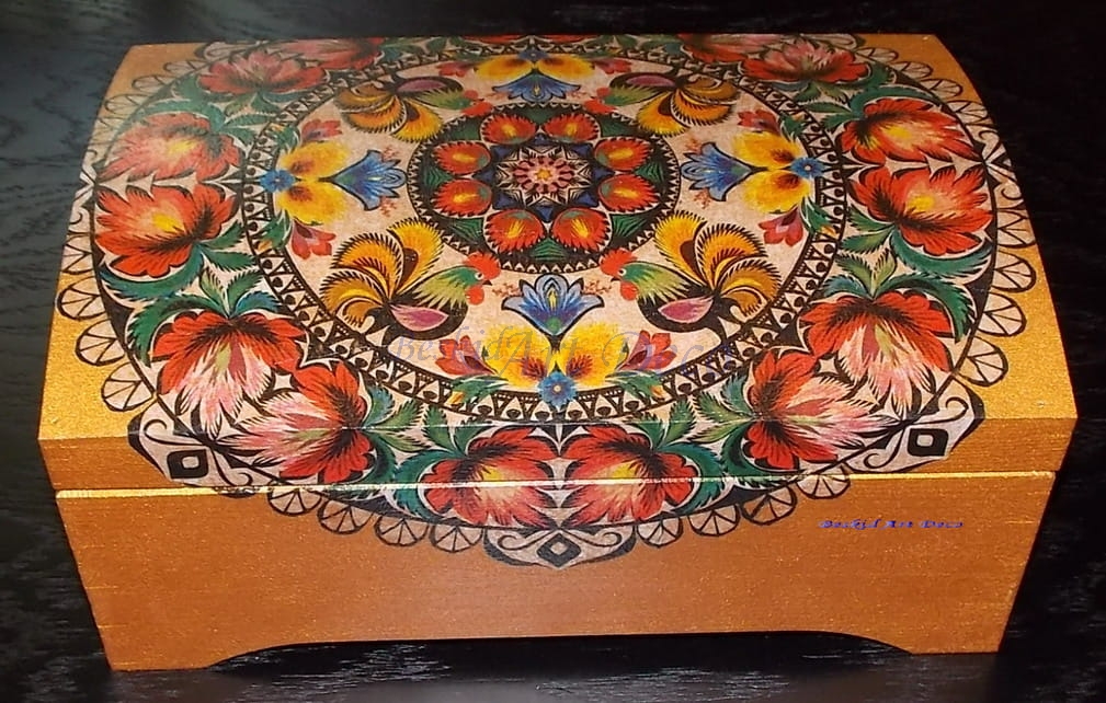 Zdobiony ręcznie metodą decoupage drewniany kufer