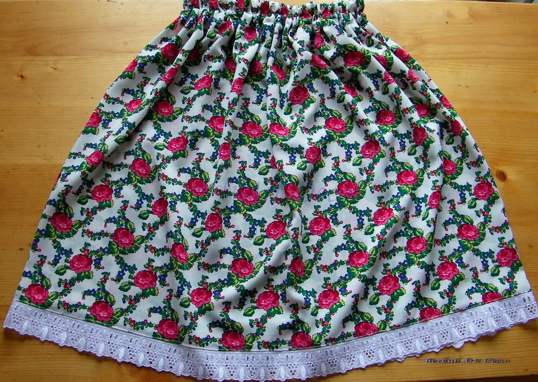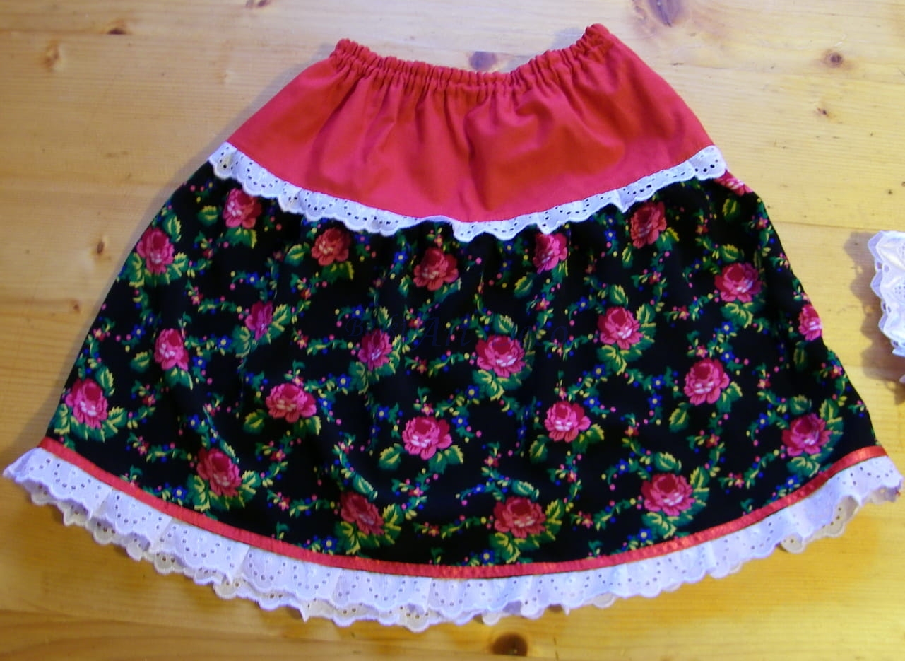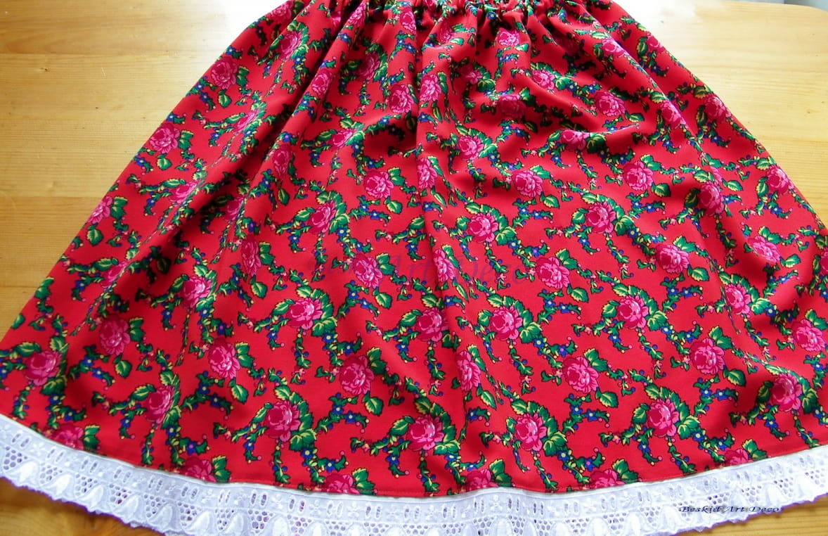 Spódniczka z czerwonym karczkiem oraz wstawką w róże z ozdobnym haftem
